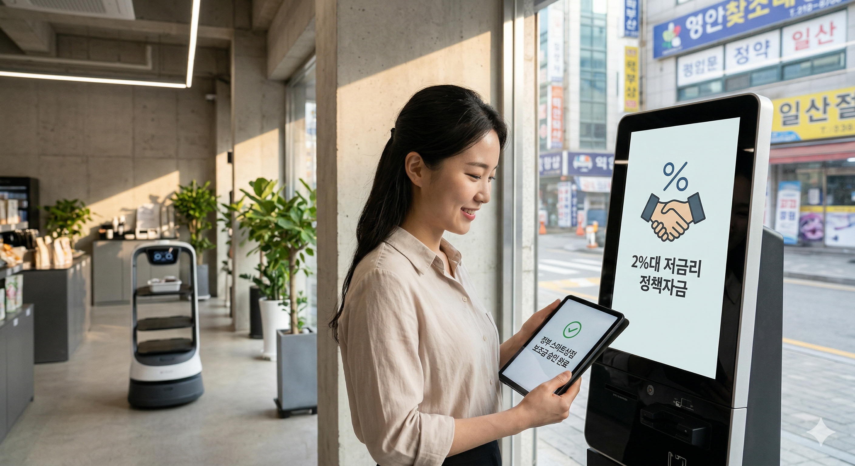 - 디지털 전환(DX) 보조금 (무상): 스마트 상점 구축을 위해 키오스크, AI 정산 시스템, 서빙 로봇 등을 도입할 때, 비용의 80%(최대 300만 원)를 무상으로 보조합니다. 대출이 아닌 돌려받지 않는 '보조금'입니다. 또한, DX 도입 기업에는 정책자금 대출 금리 우대(0.5% p) 혜택도 추가로 제공됩니다.